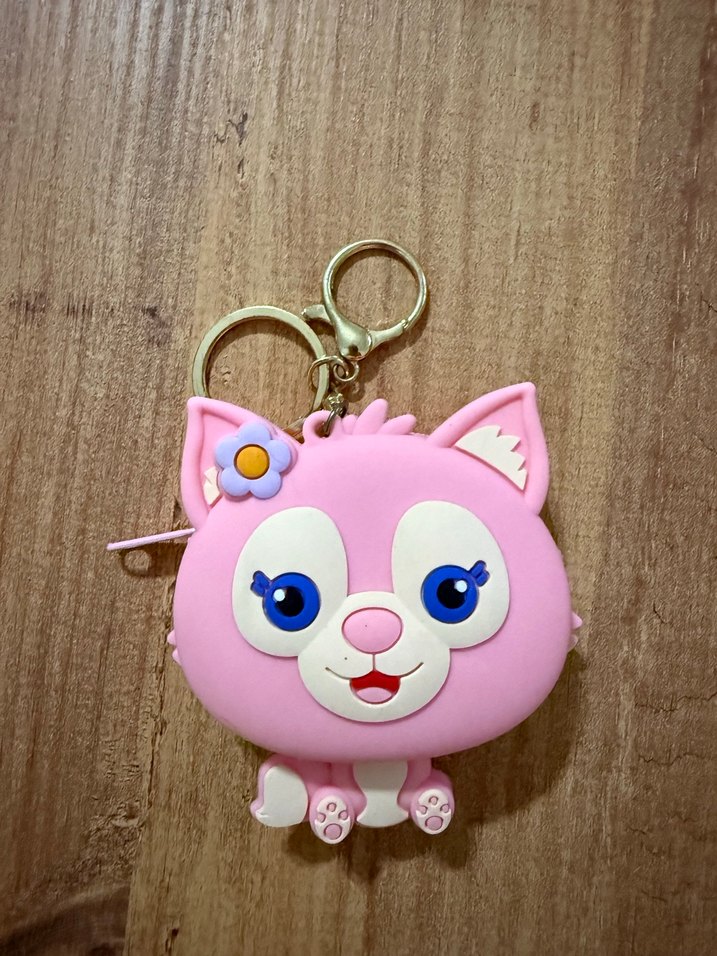 Fermuarlı bölmeli, pembe kedi figürlü anahtarlık. Altın renkli halka ve kancasıyla renkli, bohem tarzda rahat bir tasarım.