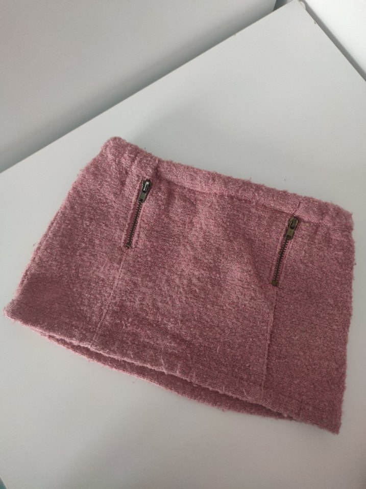 Yumuşak, rahat kumaştan yapılmış, fermuarlı iki cep bulunan pembe mini etek. Günlük kullanım için sade ve desensiz tasarım.