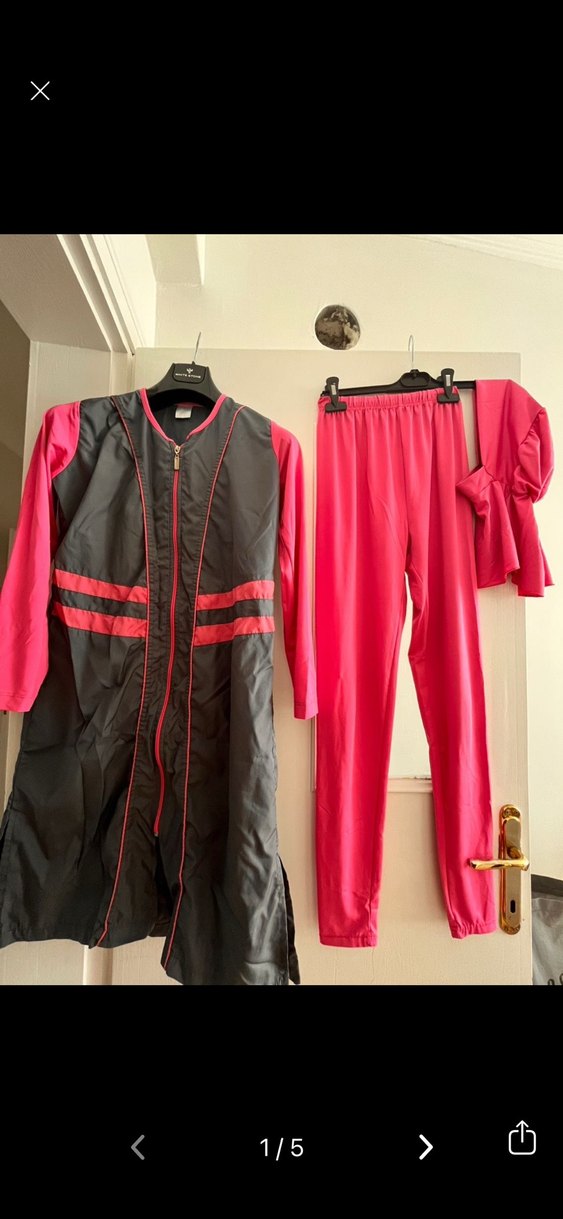 Fermuarlı, uzun kesim, yüksek yakalı ve uzun kollu kadın haşema takımı. Canlı pembe ve gri renklerde, sentetik kumaştan, bel kısmı lastikli