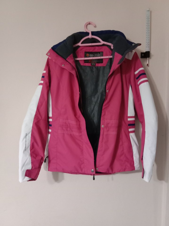 Fermuarlı, yüksek yakalı ve uzun kollu, pembe ve beyaz mor detaylı, sentetik kumaştan yapılmış, dar kesim kadın ceket. Spor ve sokak stiline uygun.