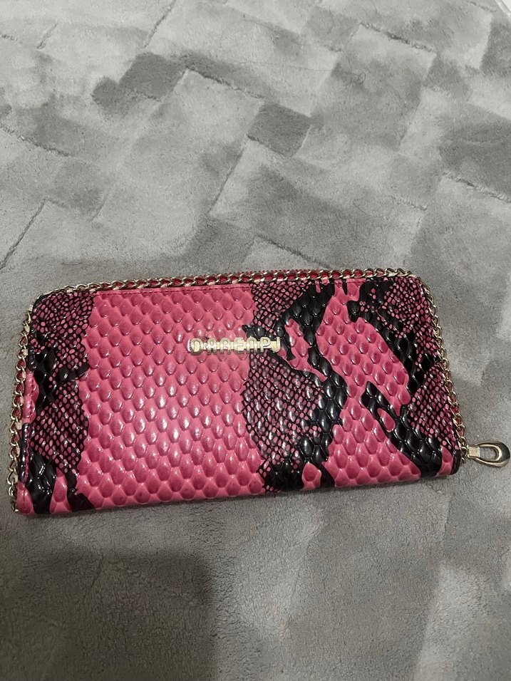 Koyu pembe deri kadın cüzdanı, yılan derisi deseni ve fermuarlı kapanışa sahip, cesur sokak stili için uygun.