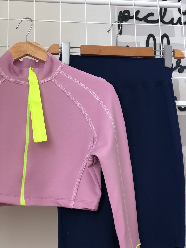 Fermuarlı, neon sarı detaylı, pembe renkli, yüksek yakalı ve uzun kollu, kesimi vücuda oturan crop ceket
