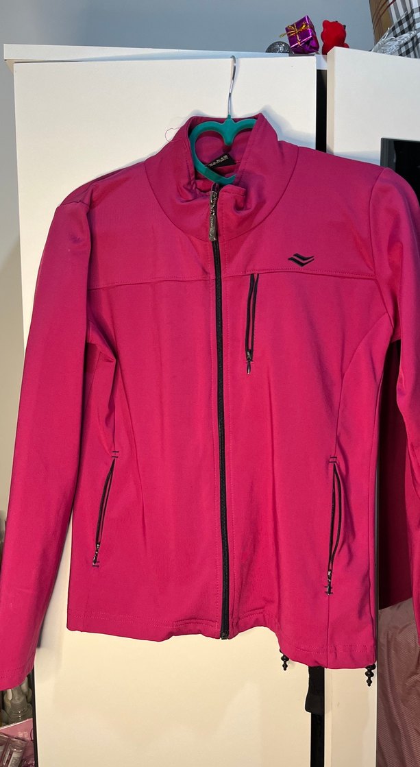 Fermuarlı, yüksek yakalı ve uzun kollu kadın ceketi. Yumuşak ve sıcak kumaştan, koyu pembe renkte, günlük sokak stiline uygun. Spor