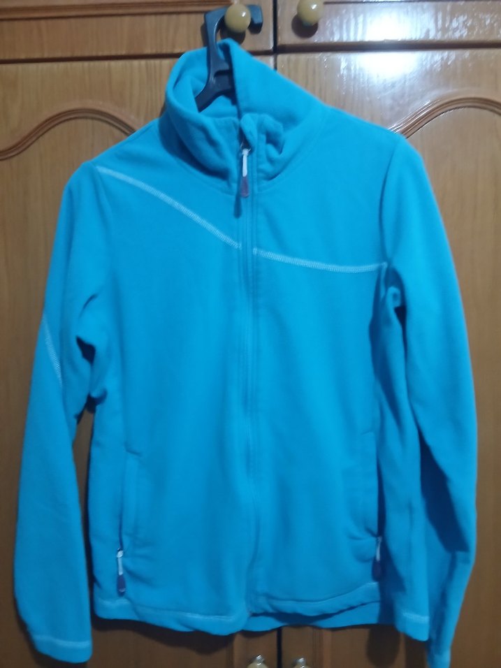 Mavi renkli, yüksek yakalı ve fermuarlı polar sweatshirt. Uzun kollu, dar kesim ve normal boyda, dış mekan kullanımı için uygundur.