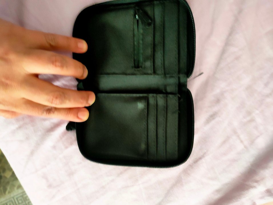 hafif rengi solmustur.Fermuarlı kapama ve çoklu kart bölmeleri bulunan cüzdan
