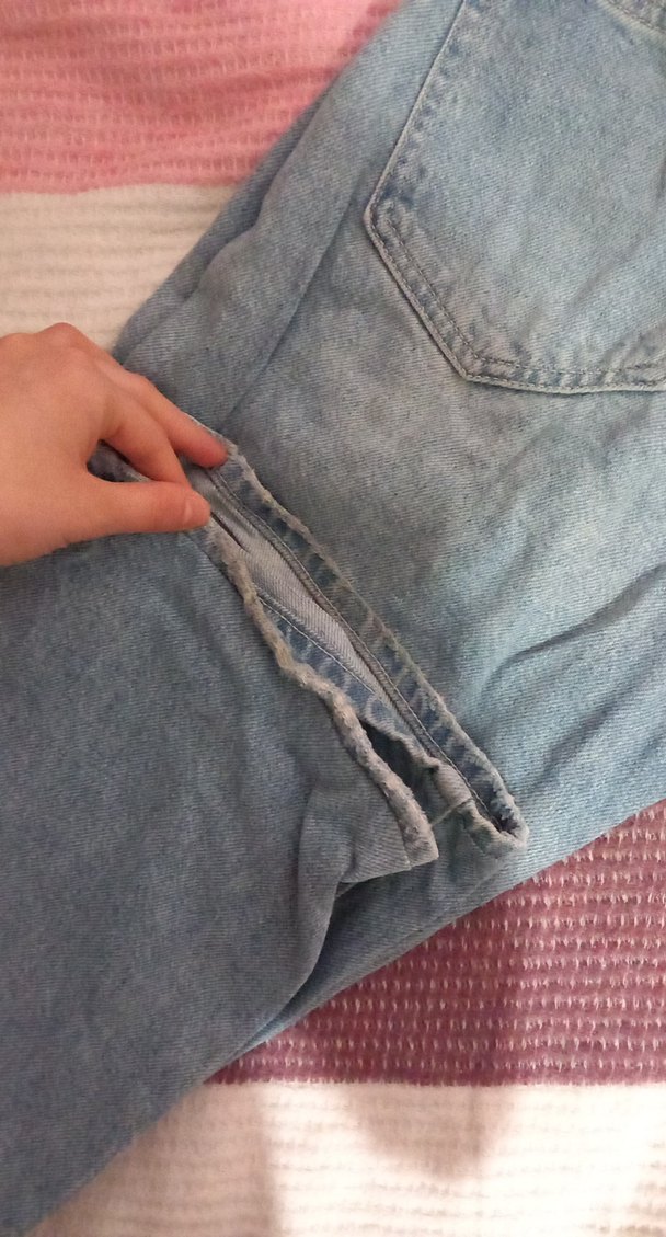 Fermuarlı detaylı, rahat kesim midi uzunlukta mavi-gri tonlarda kadın kot pantolon. İspanyol paça