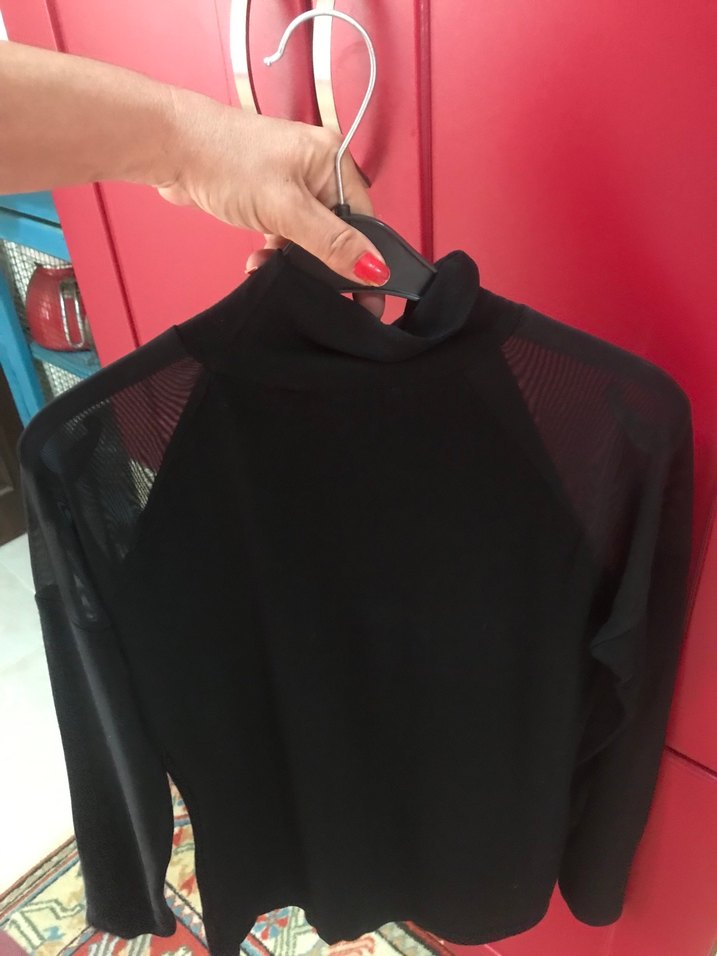Siyah, balıkçı yaka ve uzun kollu, Şeffafu omuzlu bluz