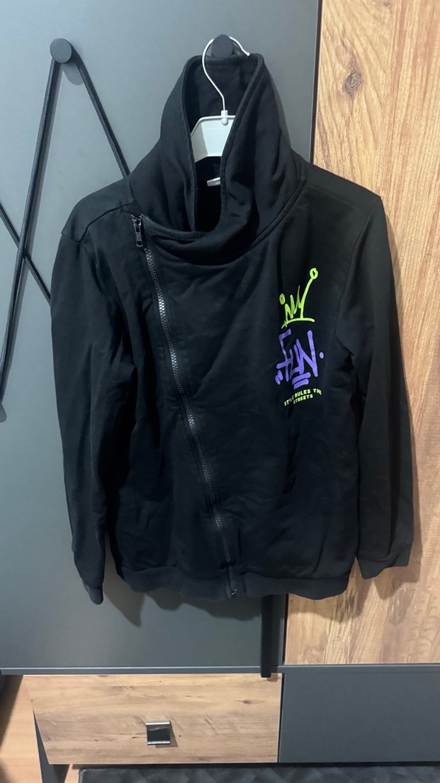 Fermuarlı ve yüksek yakalı siyah erkek çocuk ceket. Uzun kollu, baskılı ve vücuda oturan kesimiyle yumuşak ve sıcak kumaştan günlük kullanıma uygundur.