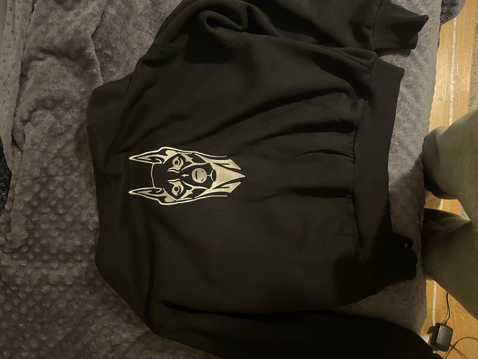 Siyah renkte, baskılı ve fermuarlı sokak stili köpek kıyafeti. Rahat kullanım ve şık tasarım sunar.