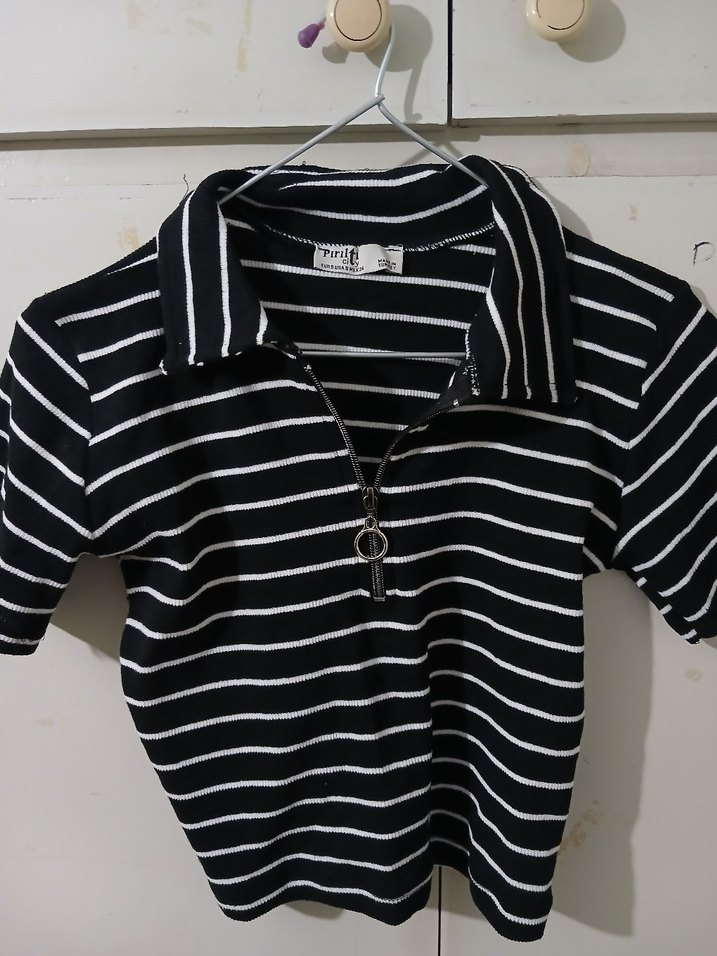 Düğmeli, kısa kollu, beyaz çizgili siyah tişört, yakalı ve ön fermuarlı, yumuşak sentetik kumaştan günlük sokak stili için uygun.