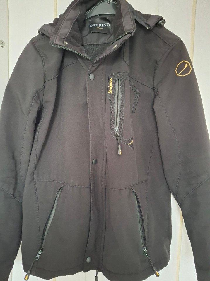 Fermuarlı ve baskılı detaylara sahip, notched lapel yakalı siyah biker ceket. Yumuşak ve sıcak kumaştan, günlük şık kullanıma uygun. DELPINO marka.Kol altı sökülmüş resimde gözüküyor ,dikilicektir