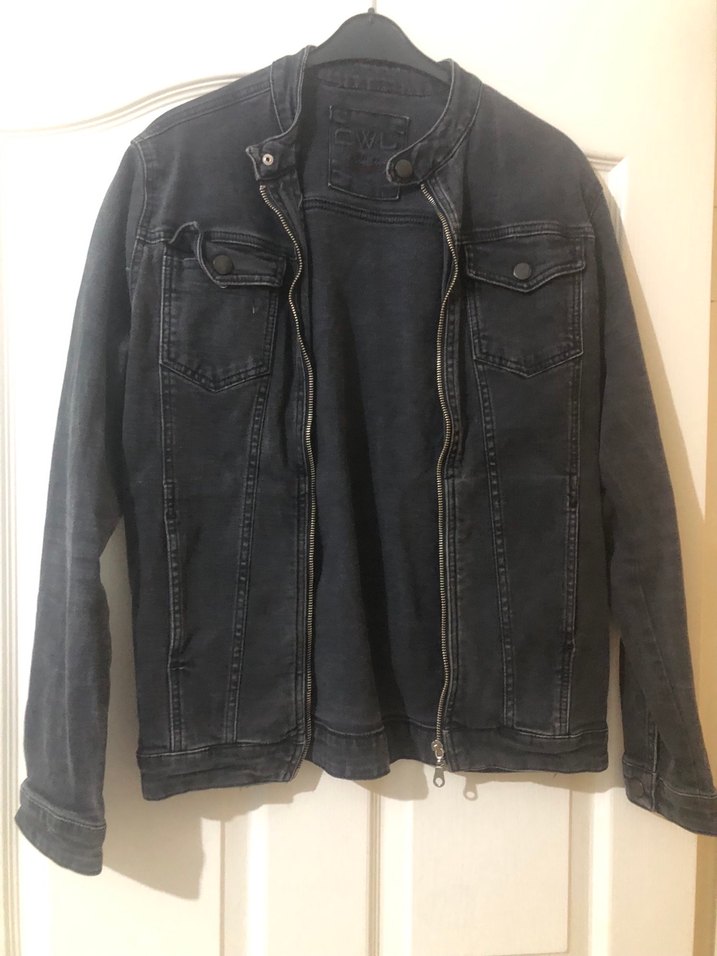 Fermuarlı, siyah biker tarzı denim erkek ceket. Notlu yaka, uzun kollu ve normal-midi uzunlukta, günlük kullanıma uygun.