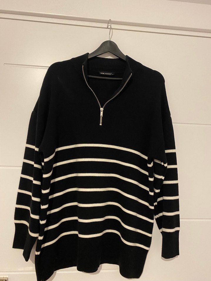 Kadınlar için uzun kollu, fermuarlı yüksek yakalı, bol ve midi uzunlukta yün kazak. Siyah beyaz yatay çizgili kazak gömlek üstü elbise olarak giyilebilir çokk güzel duruyor