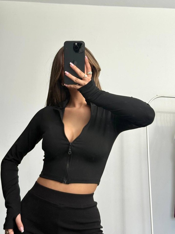 Fermuarlı Siyah Crop Üst, Yüksek Yaka, Uzun Kollu