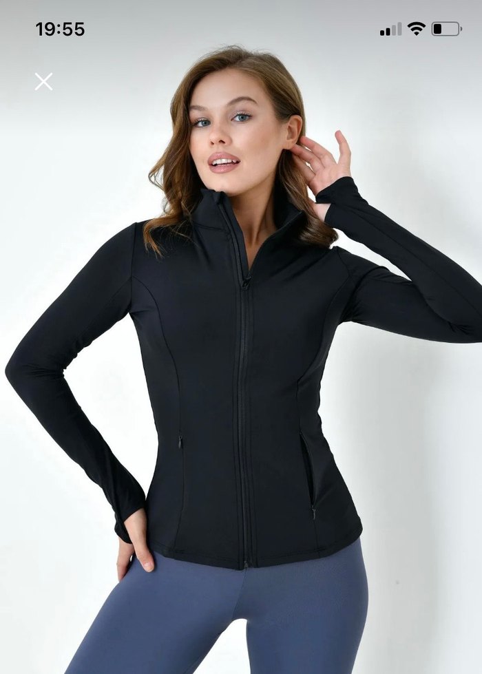Fermuarlı, yüksek yakalı, siyah dar kesim uzun kollu ceket. Pürüzsüz sentetik kumaştan yapılmış, kısa boylu ve spor sokak tarzına uygun. Oysho muadili. ENMY