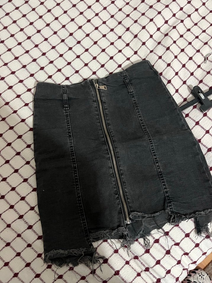Fermuarlı ve ham kenarlı, siyah denim mini etek. Trend sokak stili için uygun, günlük kullanıma ideal.