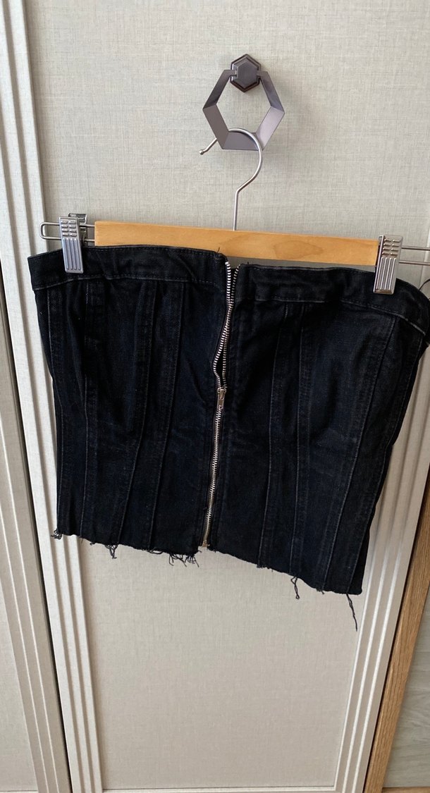 Ön fermuarlı, siyah denim üst, ham kenar detayıyla grunge punk tarzı. sunar kot straplez üst