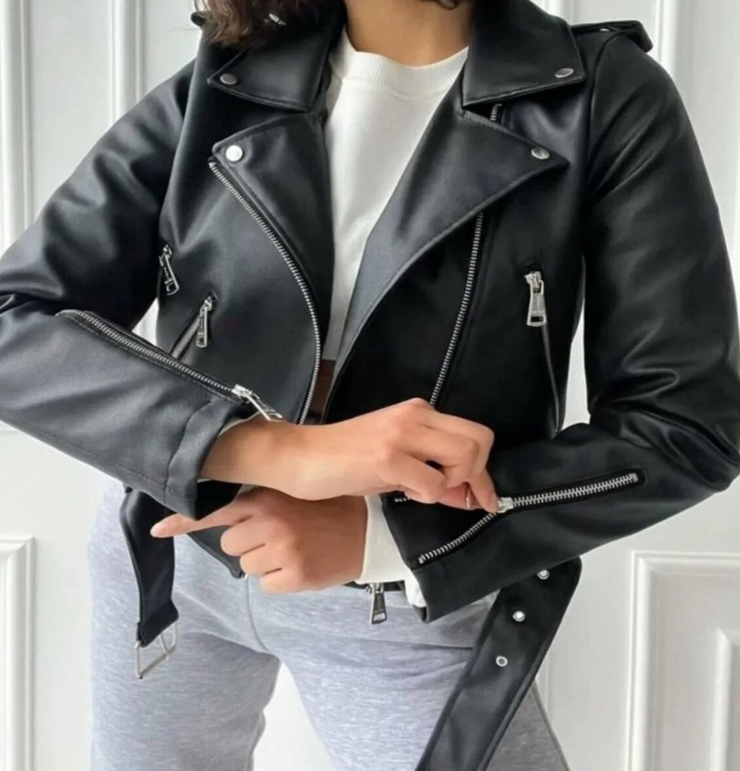Fermuarlı detaylara sahip, oturmalı siyah deri biker ceket. Notch yaka ve kayışlı kollarla midi boy, günlük şıklık sağlar.