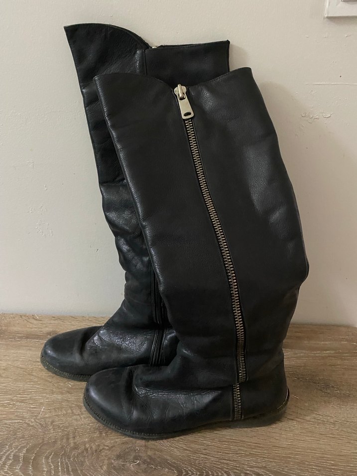 Fermuarlı Siyah Deri Diz Boyu Biker Çizme