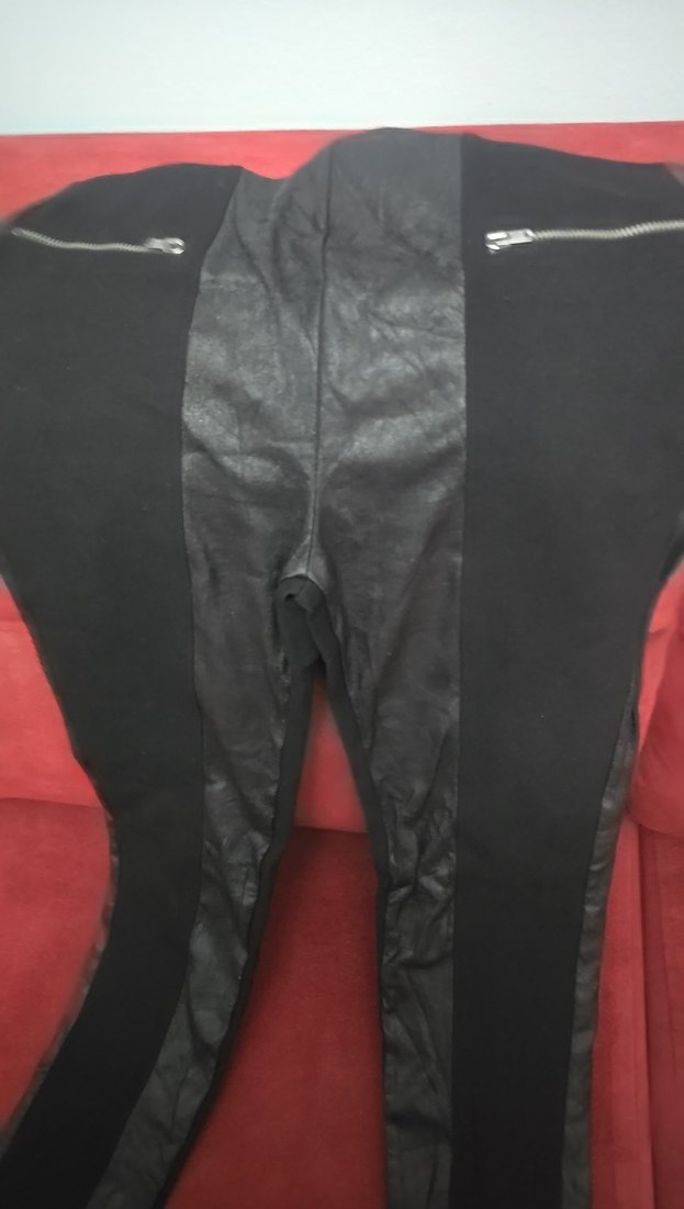 Fermuarlı detaylara sahip, siyah deri, gotik tarzda, normal midi boyda, kadın tayt. Dış mekan kullanımı için uygun.