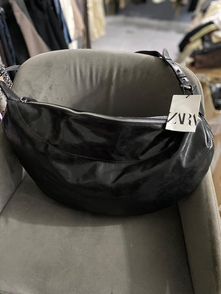 Siyah deri kadın çanta, fermuarlı kapama ve desensiz yüzeyiyle sokak stiline uygun.