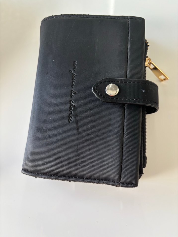 Fermuarlı bölmeli, baskılı siyah deri kadın cüzdanı. Ve çanta ile birlikte çantada hafif soyulmalar vardır onunla dışında bir sorunu yoktur.