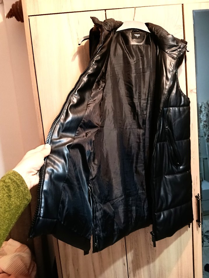 Fermuarlı, yüksek yakalı, siyah deri kadın yelek, sokak modasına uygun, kolsuz ve midi boyda. yaka kısmında hafif soyulmalar var.fiyatı bu yüzden düşük tuttum