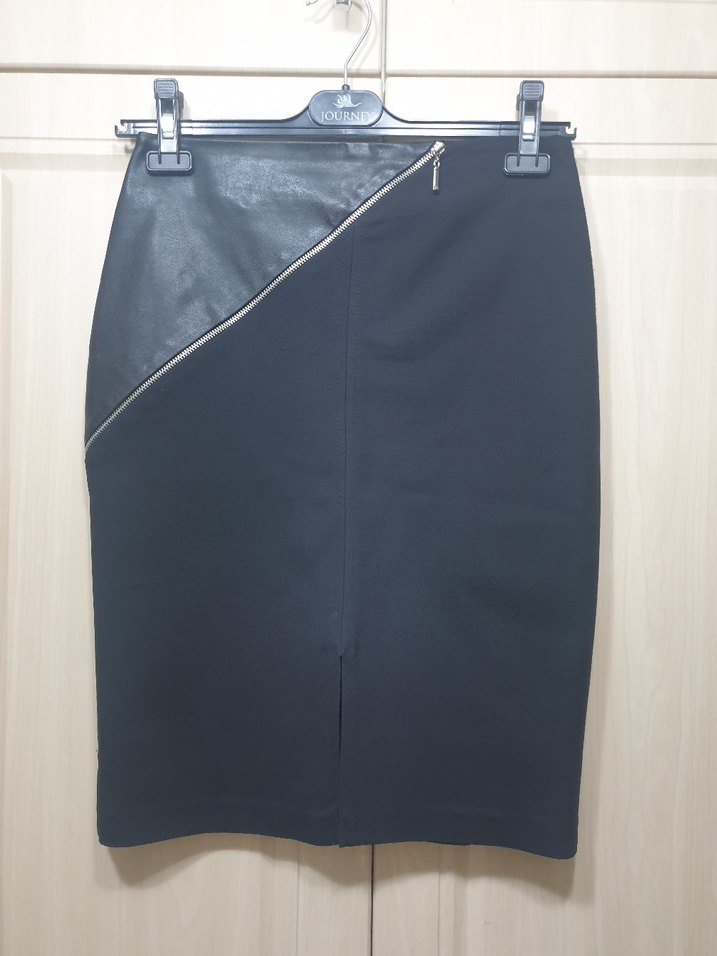 Siyah midi kalem etek, düzenli kesim ve deri detaylı fermuarlı tasarıma sahiptir, modern ofis şıklığı için uygundur.