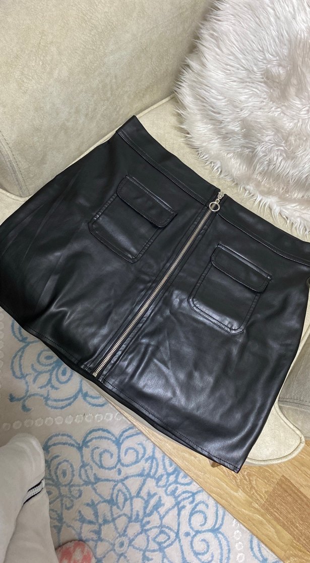 Fermuarlı ve iki küçük cepli siyah deri mini etek, günlük kullanım için uygun, sokak stili uyumlu, vücuda oturan kesime sahiptir.