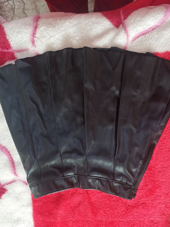 Bu siyah deri mini etek, pileli ve vücuda oturan tasarımıyla gotik ve avangart tarzlar için uygundur. Fermuarlı ve midi uzunluktadır, günlük kullanıma uygundur.