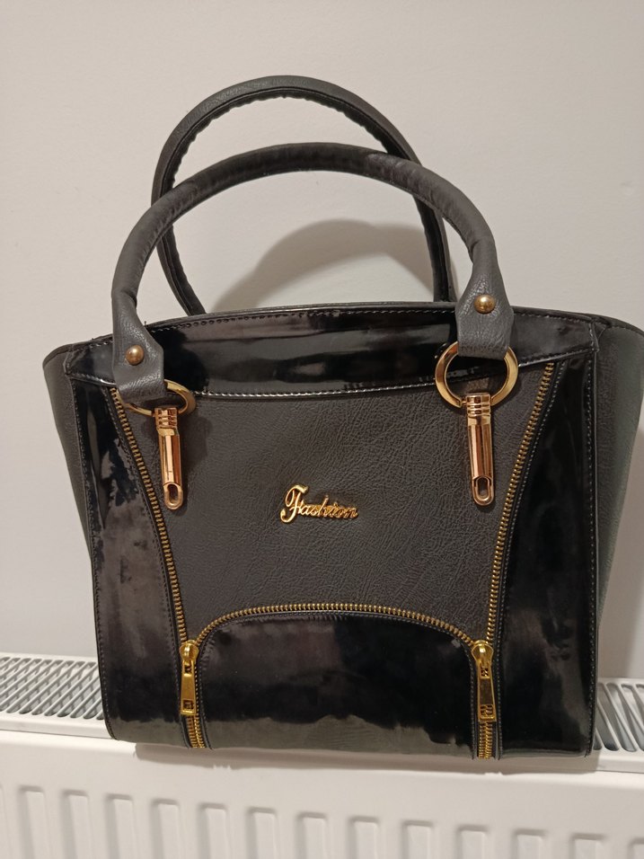 Siyah deri, parlak baskılı ve fermuarlı bölmeleriyle modern klasik tarzda, klasik zarafeti yansıtan günlük kullanıma uygun kadın çantası.