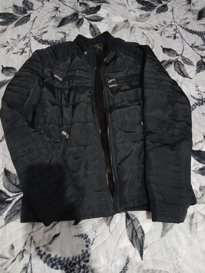 Fermuarlı, siyah renkli, yumuşak fleece kumaştan yapılmış, uzun kollu ve yakası çıtçıtlı erkek biker ceketi. Günlük kullanım için uygun, normal midi boyda.