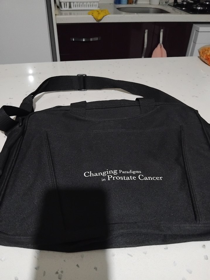 Fermuarlı tasarıma sahip siyah erkek omuz çantası, "Changing Paradigms in Prostate Cancer" yazılı baskıyla sokak stili ve athleisure için uygun, sade ve temel görünümlü. 46-34 cm