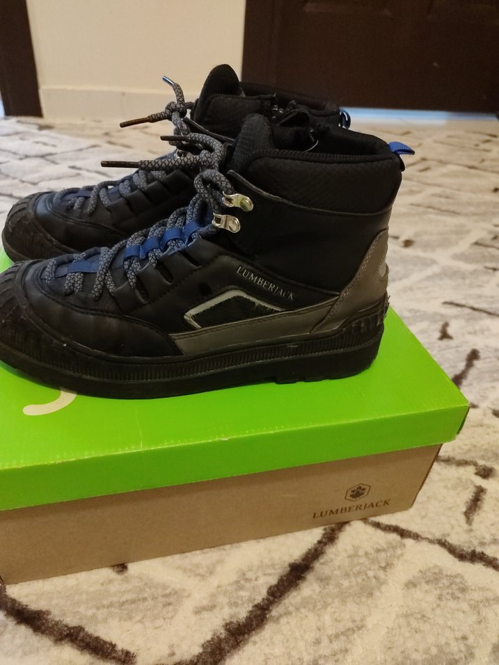 Siyah kauçuk erkek çocuk botu, fermuarlı ve koyu renkte, rock punk tarzında normcore sadeliğiyle. Desensiz ve 'Lumberjack' markalıdır.