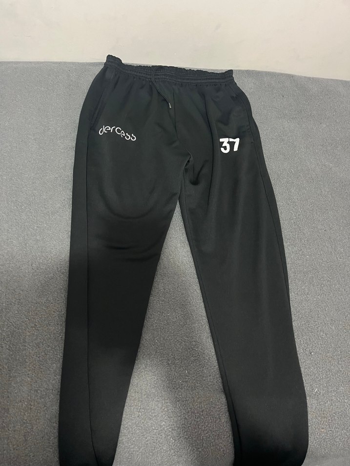 Fermuarlı cepleri ve baskılı detayları olan siyah, vücuda oturan erkek eşofman altı. Yumuşak ve sıcak kumaştan, spor ve günlük giyime uygun. ♂️