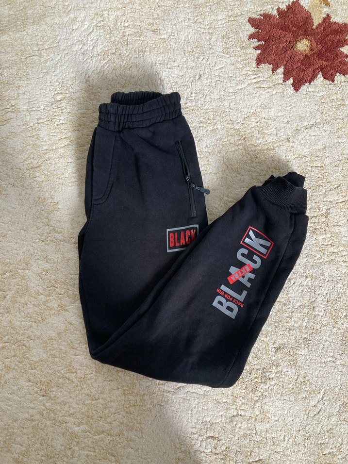 Fermuarlı cepleri ve baskılı detayları olan, rahat kesim ve normal boyda siyah erkek eşofman altı. Yumuşak ve sıcak kumaştan, spor ve günlük kullanım için uygundur.