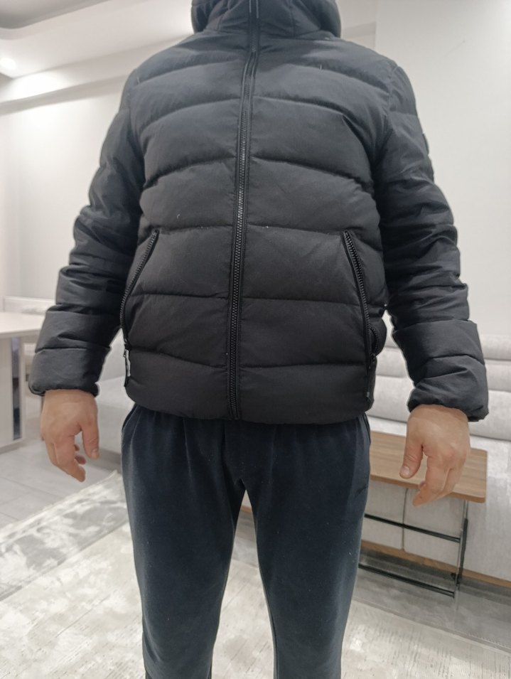 hiç bir sıkıntısi yok siyah renkte, yüksek yakalı ve fermuarlı cepli, uzun kollu erkek kapitone mont. Yumuşak ve sıcak kumaştan, günlük sokak stiline uygun. pazarlık payı vardır