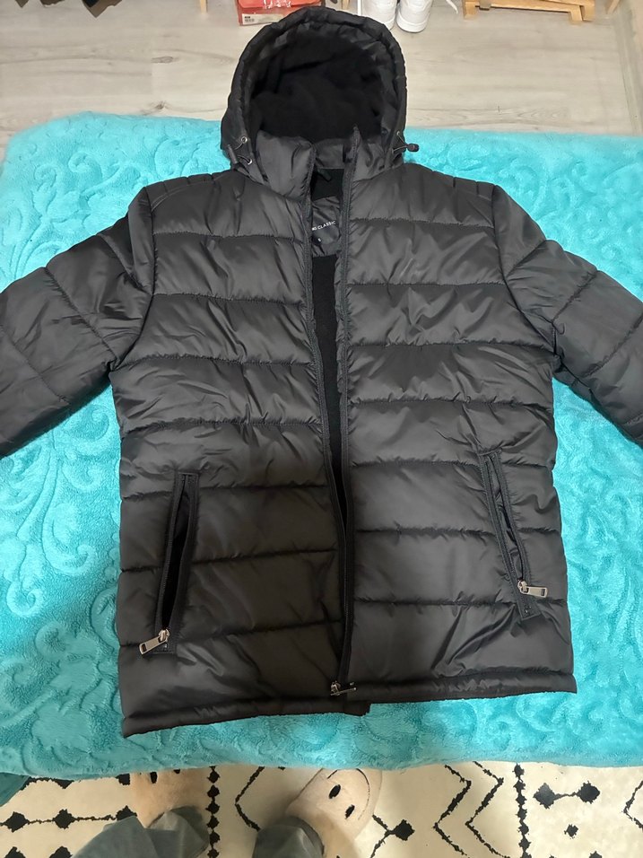 Siyah, fermuarlı, kapüşonlu erkek mont. Uzun kollu, rahat ve sıcak tutan yumuşak kumaştan, günlük dış mekan kullanımı için uygun.