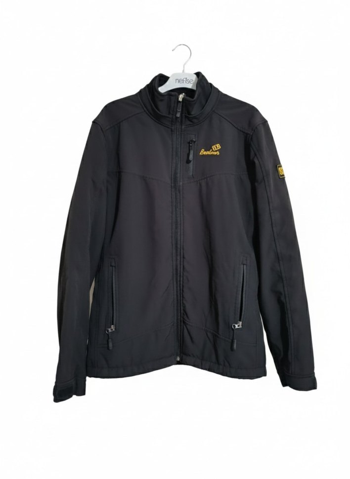 Yumuşak fleece kumaştan, fermuarlı cepler ve baskılı detaylara sahip, uzun kollu yüksek yakalı siyah erkek kayak montu. Rahat kesim ve dış mekan kullanımı için uygundur.