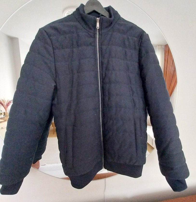Fermuarlı, yüksek yakalı ve uzun kollu siyah erkek mont, yumuşak ve sıcak dokusuyla rahat bir sokak stili sunar.