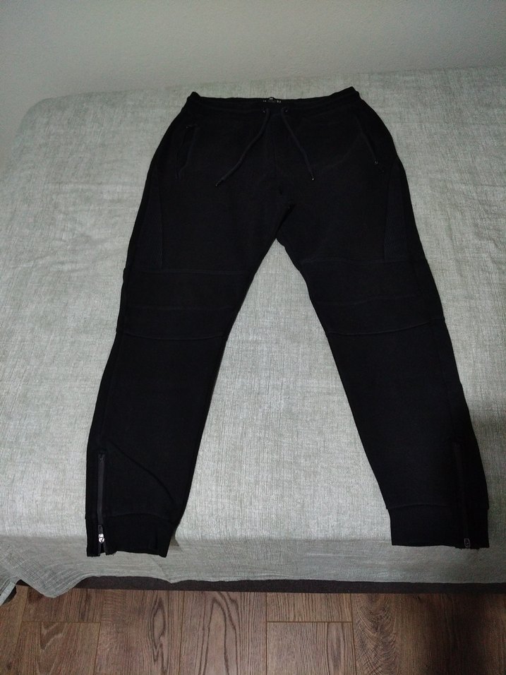 Fermuarlı paça detaylı, siyah renkli, yumuşak dokulu, dar kesim erkek outdoor eşofman, ürünün sadece cep fermuarları çalışmıyor
