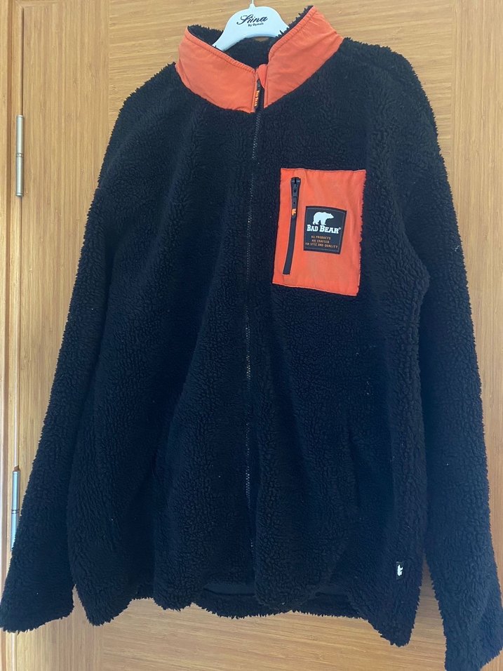 Uzun kollu, yüksek yakalı siyah erkek polar sweatshirt. Ön fermuarlı ve turuncu fermuarlı göğüs cebi bulunur. Salaş kesim, midi boy ve günlük rahat stil için uygun.