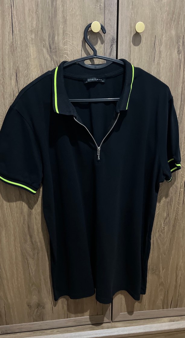 Fermuarlı yakalı, kısa kollu, neon yeşil detaylı siyah erkek polo tişört. Sentetik kumaştan, sokak stiline uygun, günlük kullanım için ideal. Kusuru defosu yok, beden küçük geldiği için satışta