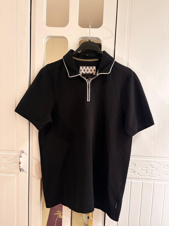Erkekler için siyah renkli, fermuarlı, kısa kollu ve yakalı polo tişört. Sentetik kumaştan, günlük kullanıma uygun, dar kesim.