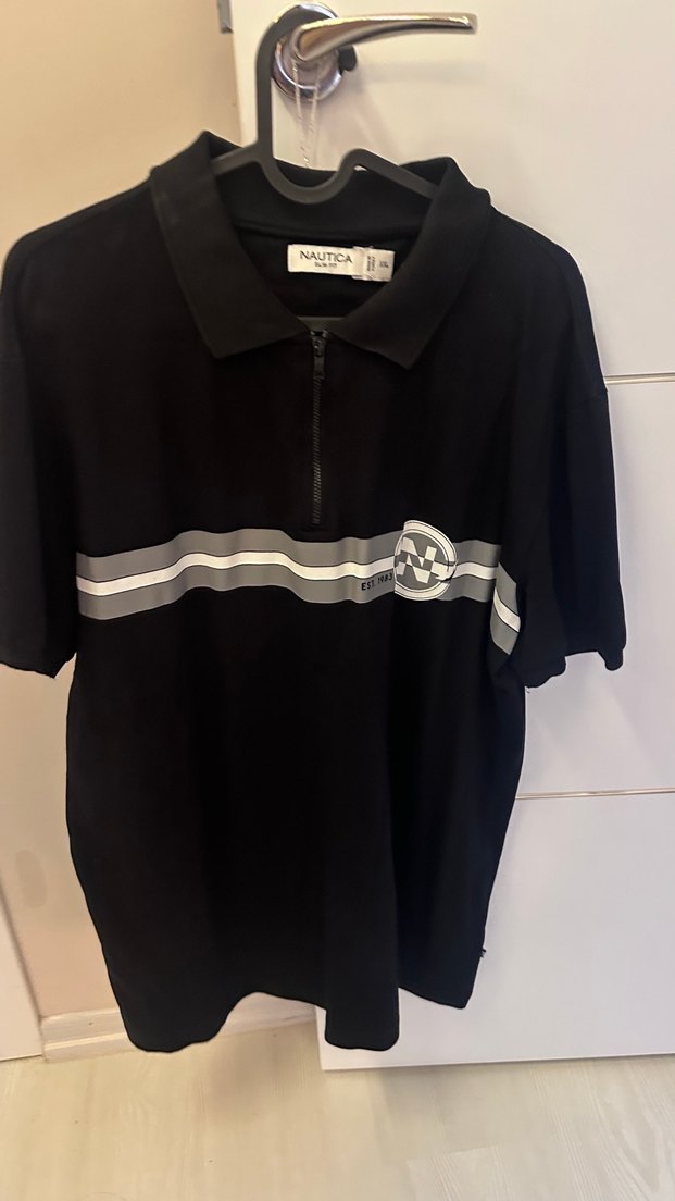 Fermuarlı yakalı, kısa kollu siyah erkek polo tişört. Göğüste baskılı çizgi deseni bulunur, sentetik kumaştan üretilmiştir. Sokak stiline uygun.