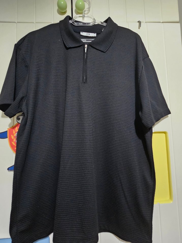 Fermuarlı, kısa kollu, yakalı siyah erkek polo tişört. Rahat kesimli ve yumuşak sentetik kumaştan, günlük sokak stili için uygun.