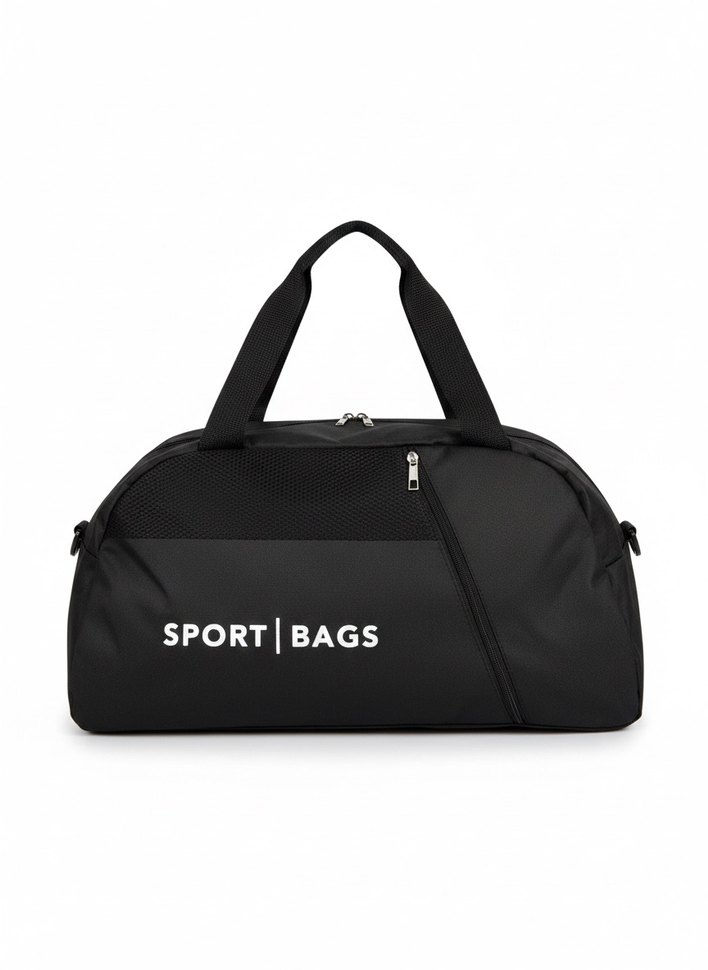 Fermuarlı ana bölmeli, baskılı marka detaylı siyah erkek spor çantası. Dayanıklı sapları ve koyu renkli tasarımıyla sokak stiline uygun.