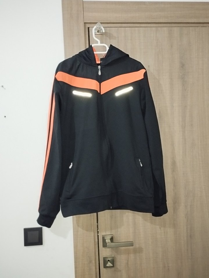 Fermuarlı cepli, uzun kollu, yüksek yakalı siyah erkek sweatshirt. Turuncu şeritler ve reflektör detaylarıyla spor ve günlük kullanıma uygun.
