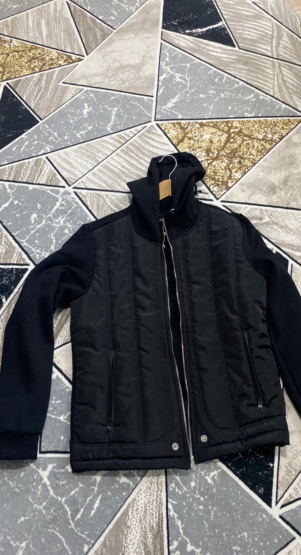 Fermuarlı, yüksek yakalı ve uzun kollu, siyah erkek mont. Yumuşak ve sıcak kumaştan, günlük sokak stili için uygun.