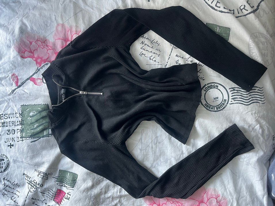 Siyah, fermuarlı ön kısmı ve uzun kollu, yarım balıkçı yaka kadın bluz. Gotik tarzda, günlük kullanıma uygun, sentetik dokulu kumaştan.